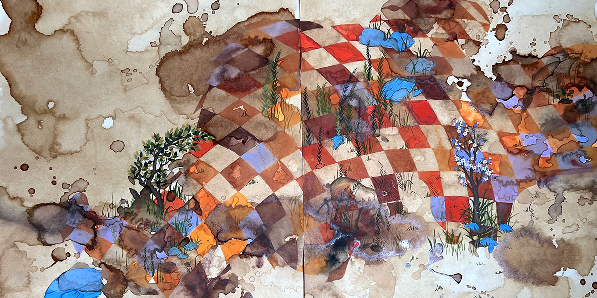Top Image: Mitti (detail) 2024, Gouache, natural pigments and tea on handmade vasli paper, 16 x 25 inches.