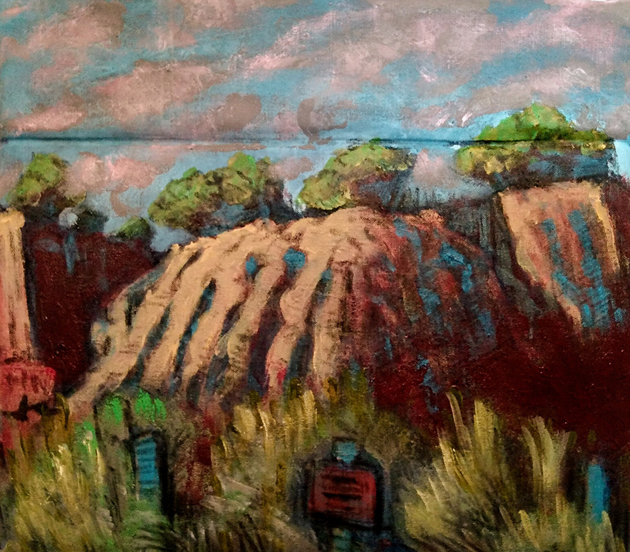 Charles Grabinsky “Dangerous Terrain” 2022, acrylic and conte crayon on linen book cover, 8 x 7 inch, $125.00
