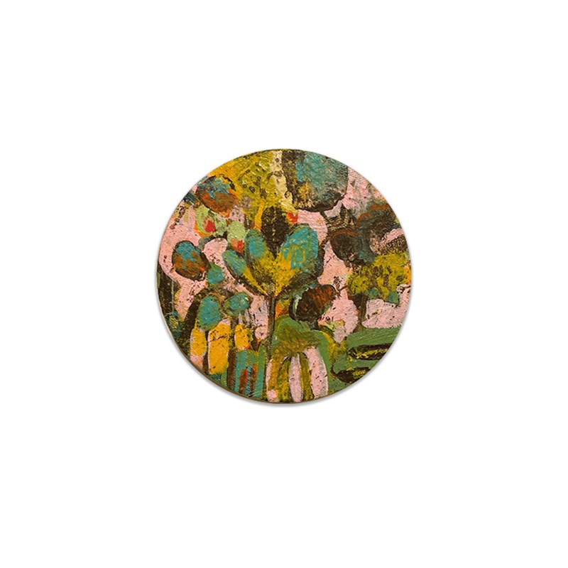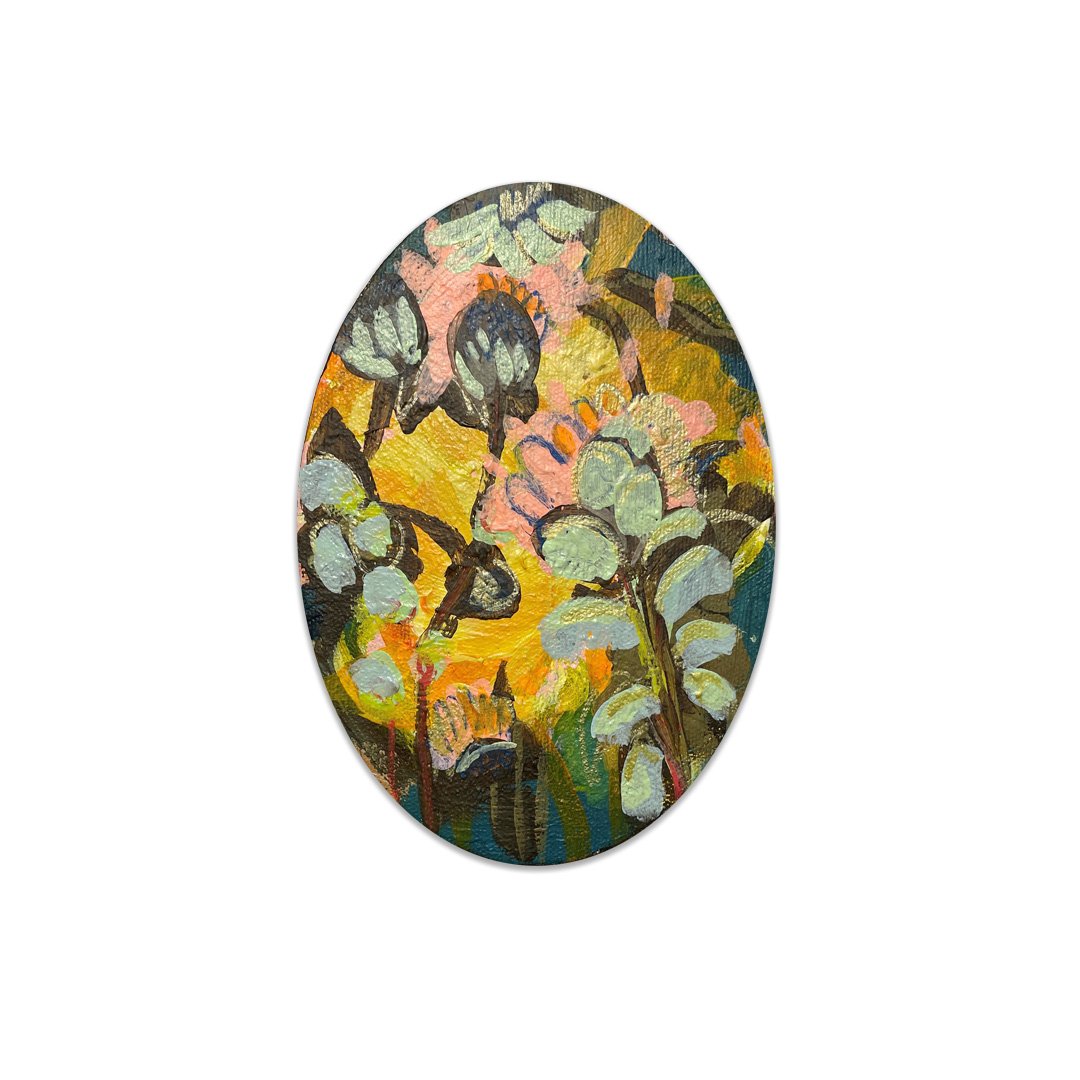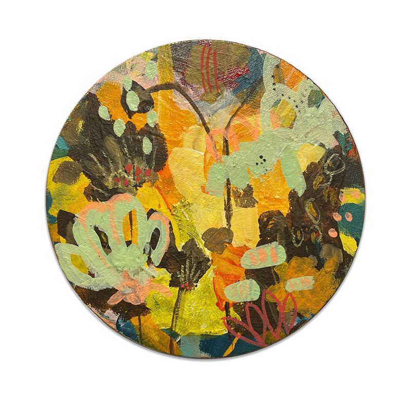 Meghana Gauthier “Jardine Ronde” September 2021, mixed media acrylic on canvas, 8 inch diameter, $125.00